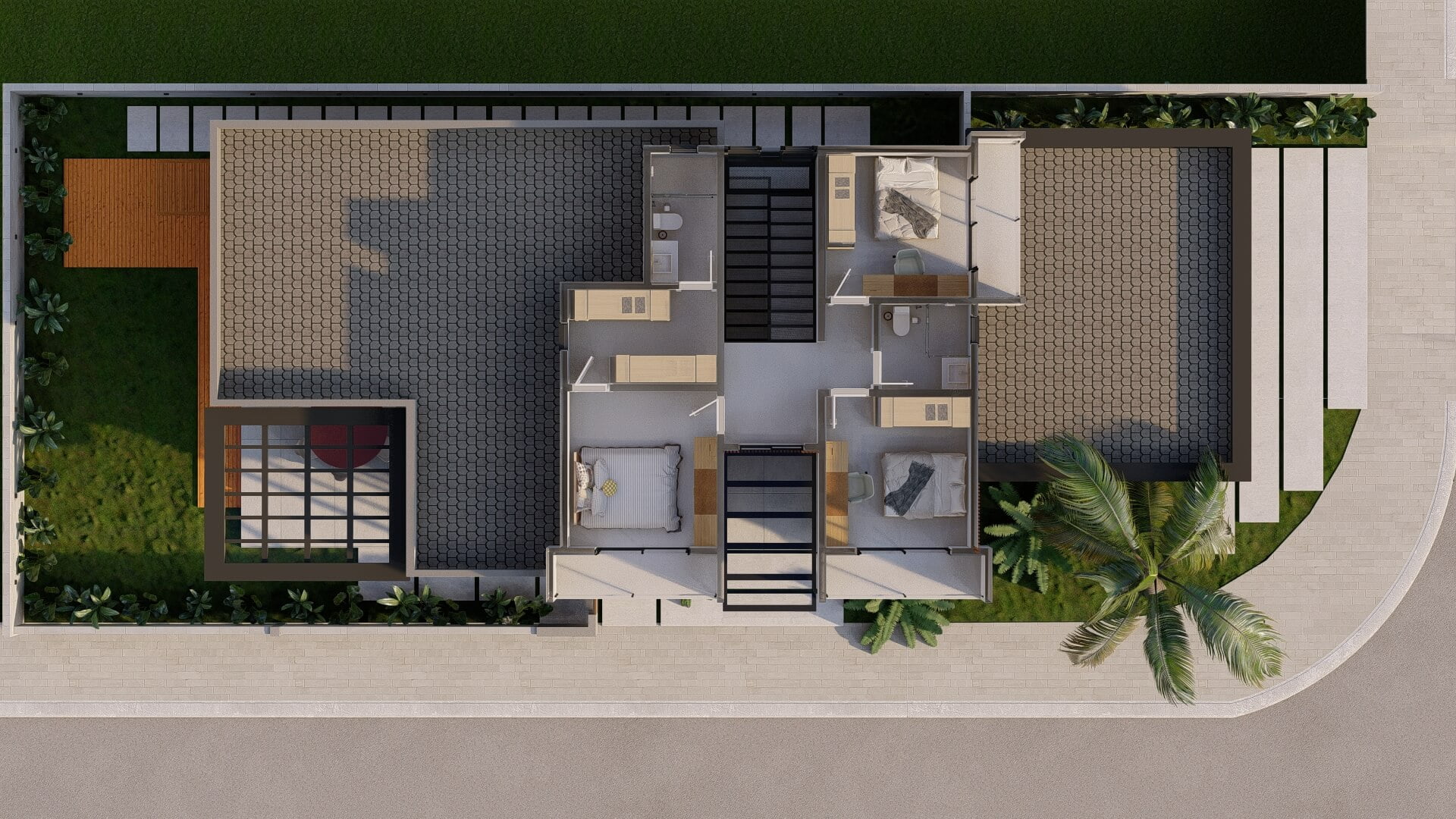 A fachada do projeto é ousada e inovadora, desviando das normas tradicionais para criar uma impactante fachada social lateral. A posição dos quartos, estrategicamente planejada para receber a luz matinal, e das áreas úmidas, banhadas pelo calor do entardecer, demonstram um equilíbrio energético excepcional.