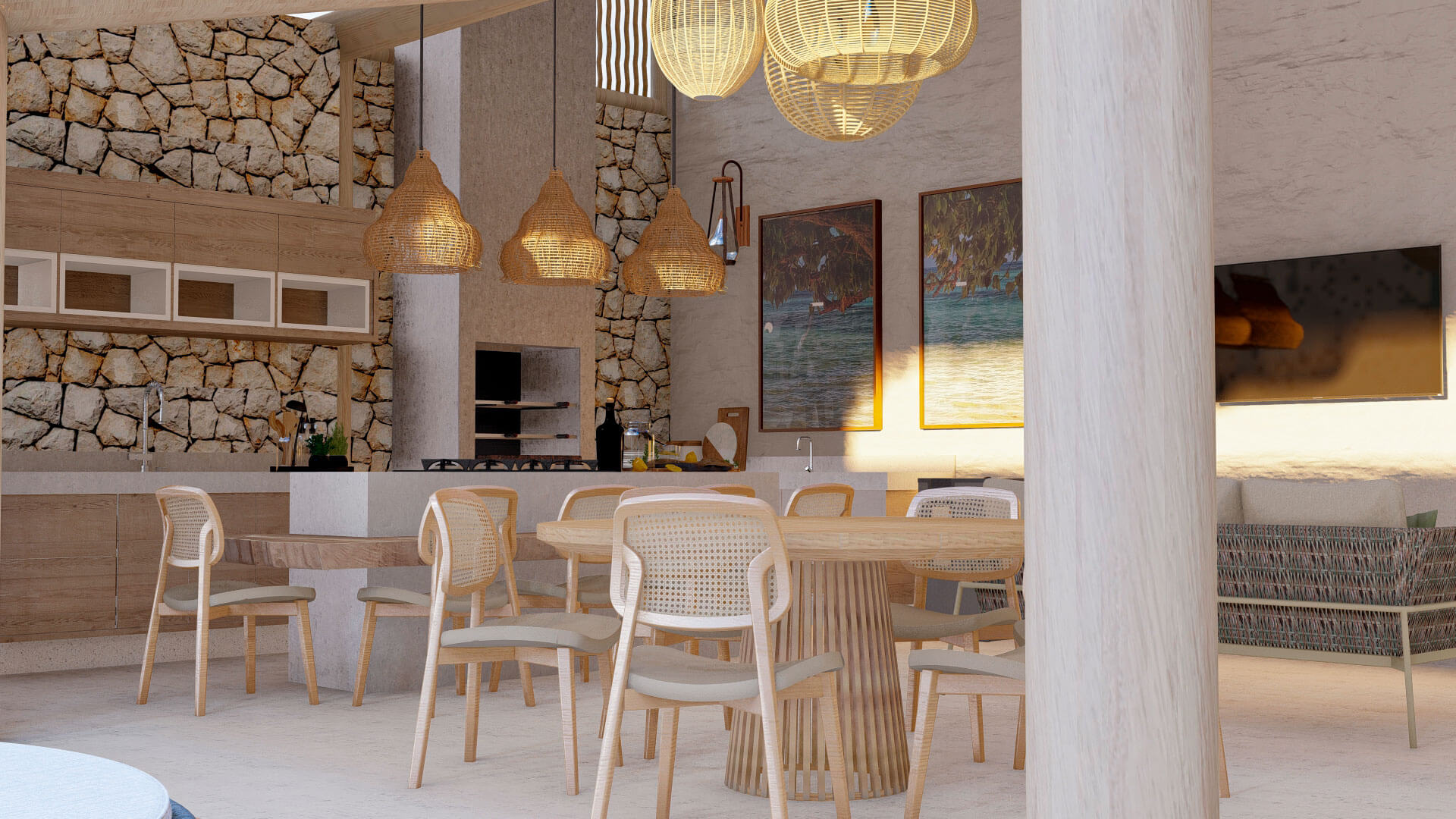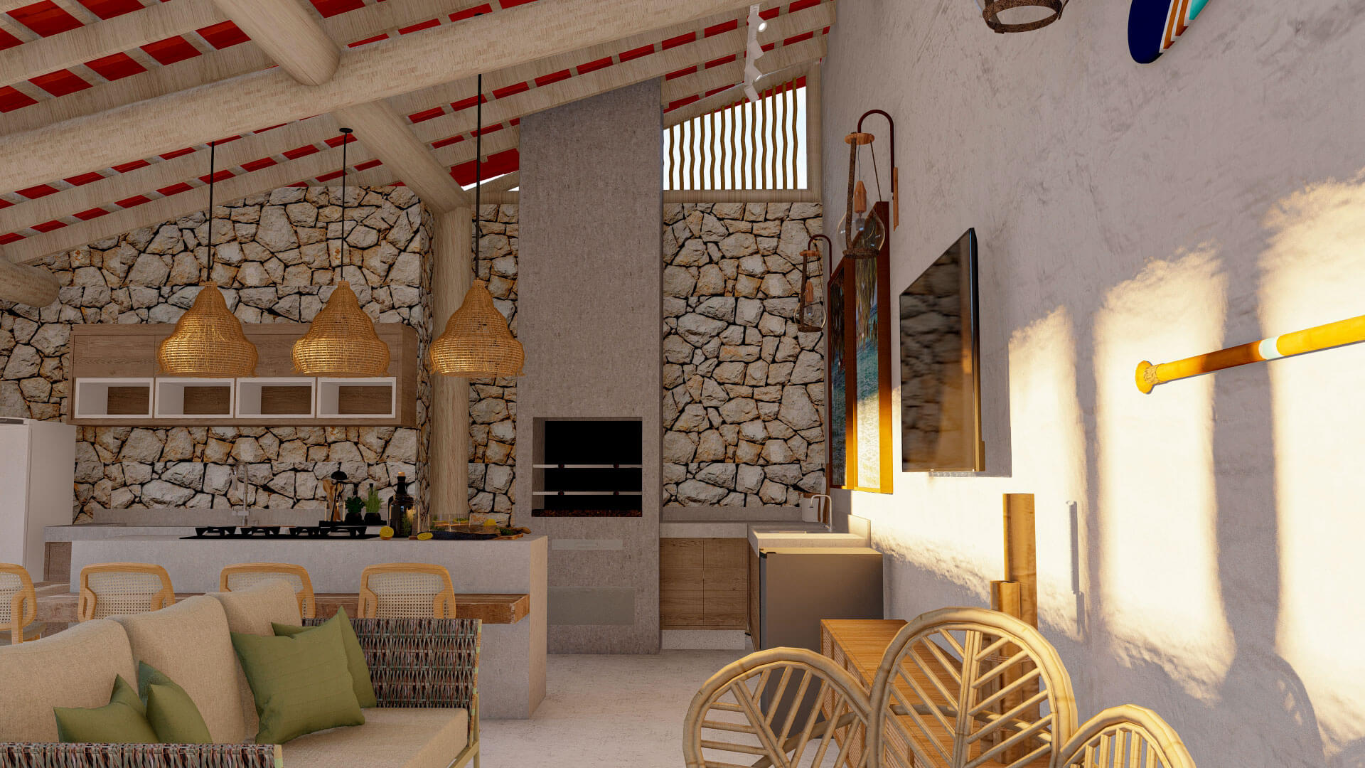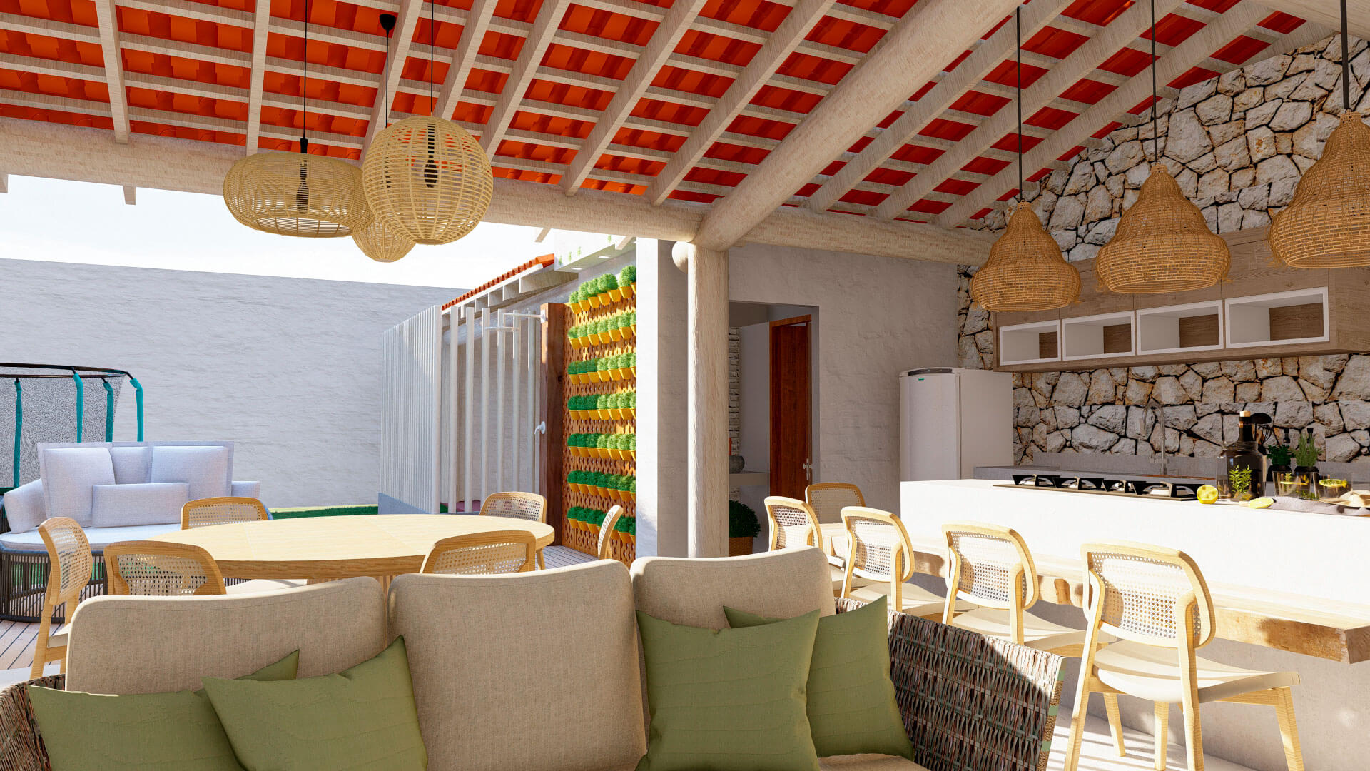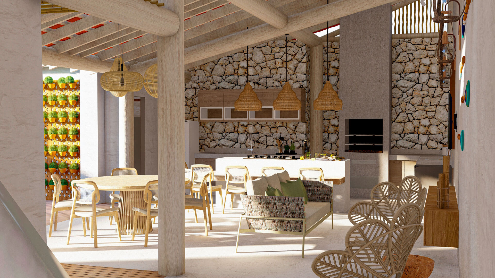 Na área gourmet, a madeira é a protagonista. O espaço é enriquecido por luminárias e cadeiras de bambu, adicionando um toque de autenticidade à atmosfera. A parede texturizada com pedras, em tons claros que ecoam a madeira, aprofunda a sensação de conexão com a natureza. A presença do jardim vertical na parede acrescenta um elemento orgânico e vivo, unindo-se ao tema natural do espaço.