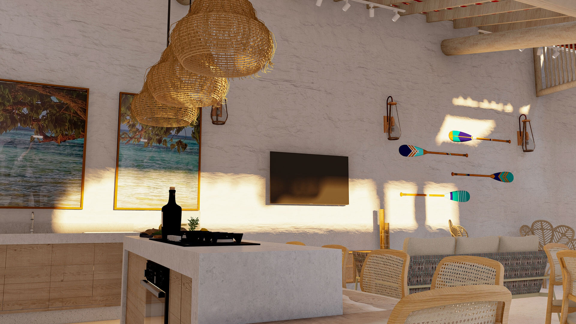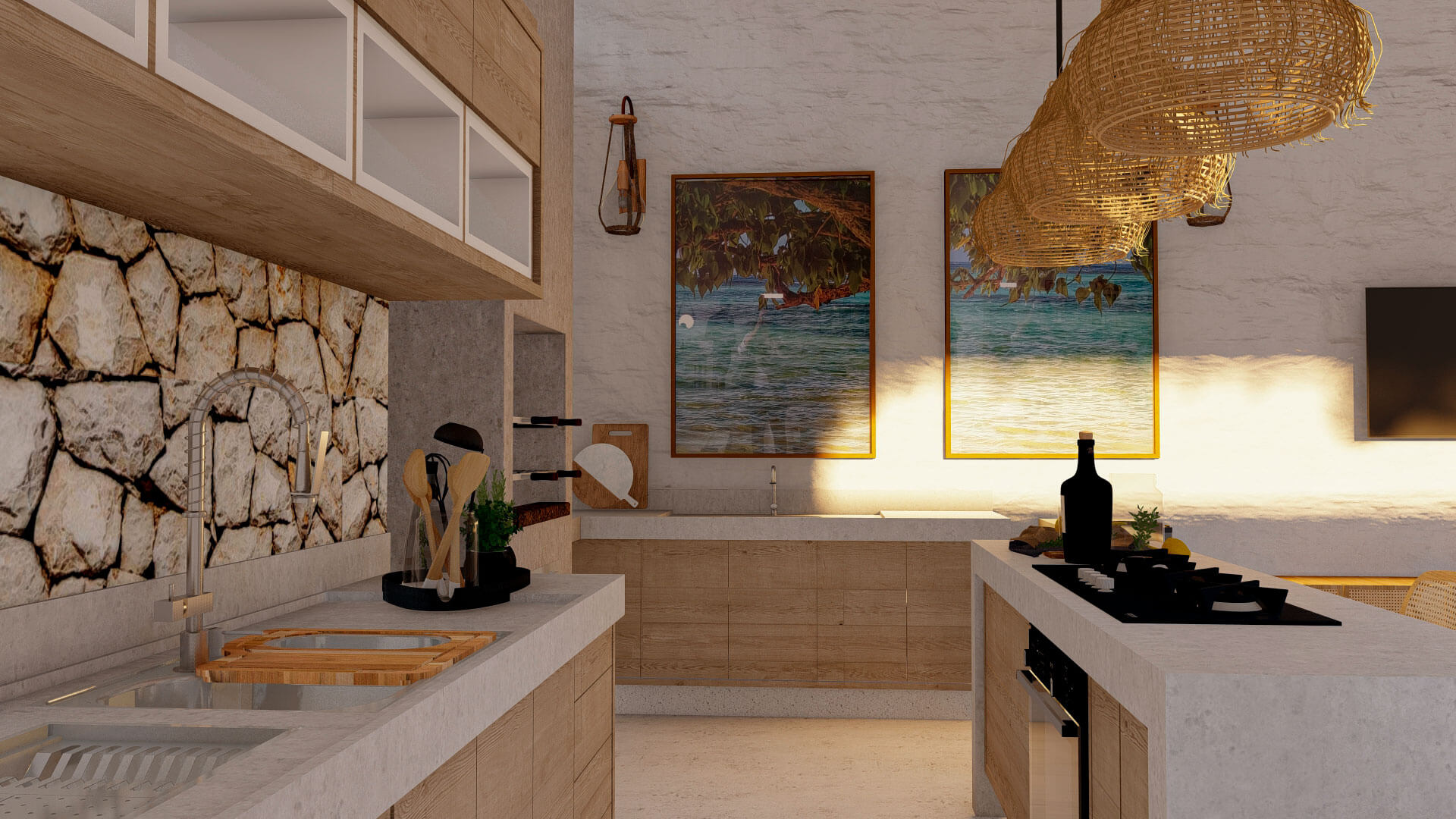 A cozinha segue a mesma abordagem, com um foco coeso em tons de madeira. A escolha de utilizar madeira em todos os aspectos, incluindo as luminárias de bambu, reforça a estética natural e unificadora do projeto. A uniformidade do padrão de design contribui para uma sensação de fluidez e integração em todo o espaço.